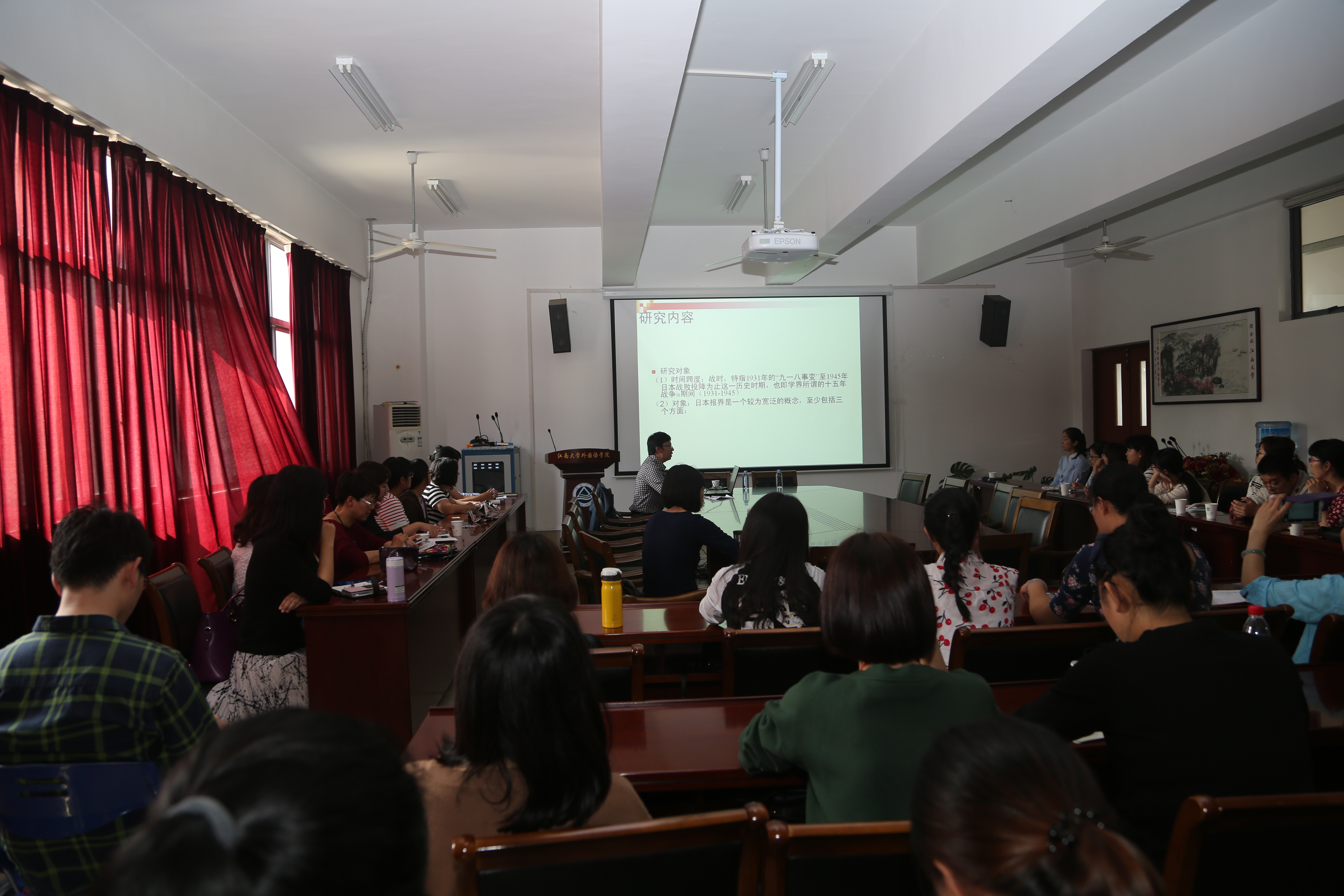 孙博士以“战时日本报界法西斯化研究”为题,先介绍了此项研究的选题依据、国内外研究状况及研究思路方法,然后从战前日本报界的发展概况、战时日本报界的转向、政治传播、战争宣传以及日本新闻界的人物等方面,详细介绍了日本新闻媒体在战争中的法西斯化倾向,并在此基础上指出了有待探讨的问题。整个讲座资料详实、旁征博引,让到场的师生对于战时日本报界的状况有了较为全面的了解,并启发师生对战时日本报界的影响作进一步深刻思考。