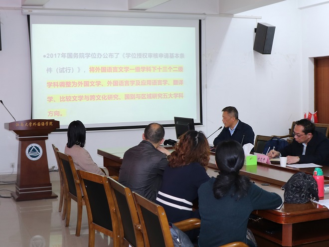 讲座伊始,王教授从“顶天”、“立地”两个原则切入,指出学科建设既要服务国家战略、深入学科前沿,又要服务地方建设、考虑社会需求,强调学科建设必须满足“符合当代科技发展趋势”、“符合国家经济和社会发展的需要”、“有较好的建设基础”和“能够通过学科交叉融合,形成新的学科方向和特色来带动相关学科发展”四个要求。接着王教授结合《新文科建设宣言》和《研究生教育学科专业目录》等资料,对外语学科的发展历程及其内涵的调整进行了回顾,阐释了将区域国别学设立为一级学科的重要性。王教授指出,学科建设包含学科定位、学科队伍、科学研究、人才培养等诸多要素,反映了高等学校的办学实力与核心竞争力,因此必须突出特色,做到“人无我有,人有我强、人强我新”。
