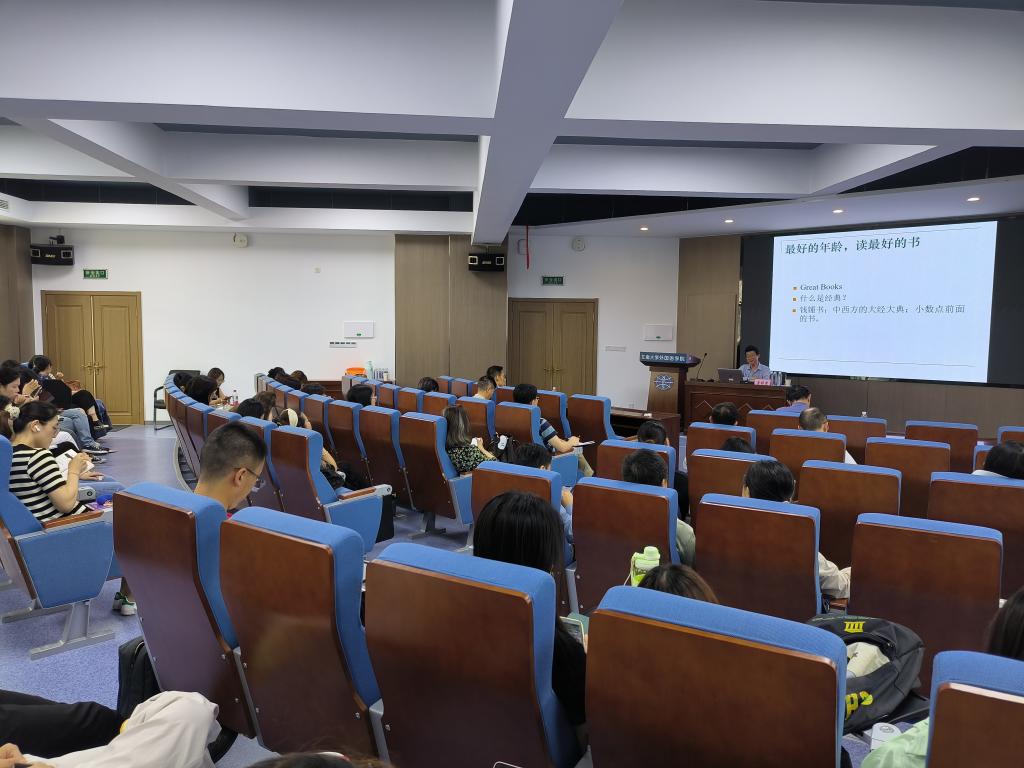 随后,查明建教授围绕“何为文学经典”“为何要读文学经典”以及“如何从文学经典阅读中培养审美能力”三个问题对文学经典作品在审美教育中的作用进行了深入的解读。他首先解释了文学经典的定义,阐述了阅读文学经典的重要性,指出文学不仅能帮助人们向上向善,还能让我们更深入地了解人性,洗涤灵魂。在谈到如何从文学经典阅读中培养审美意识时,查明建教授旁征博引中外名著,不仅让在场师生领略了大师风范,同时也展示了经典文学作品经久不衰的魅力。查明建教授强调,文学并不是与我们生活无关的一门学科,而是深深植根于我们日常生活之中,是人工智能时代背景下培养人文精神和审美能力不可或缺的重要渠道。