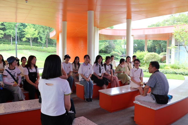 金匮公园是江苏省首个汇聚“六区十八景”的党建主题公园,旨在打造“有内涵、有颜值、有温度,现代化、智能化、共享化”的红色记忆打卡点,努力建设成为全国一流的公园式、开放式党群服务中心。值得一提的是,公园内特别设置了8个初心驿站,分别展示8个市(县)区党建引领高质量发展的成果。在游览过程中,蔡老师结合自身经历,详细为我们讲解了无锡本地的党政建设成果、历史文化背景和社会发展状况,介绍了中国共产党和无锡人民几十年来的峥嵘岁月和奋斗历程,让同学们在观光的同时汲取奋进力量,收获精神补给。