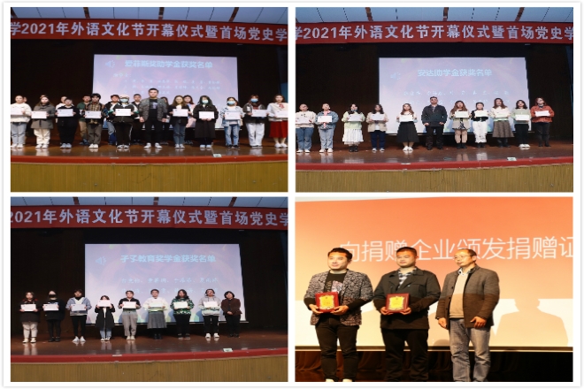 学院分团委书记陆芳老师宣读了学院2020年获得各项荣誉的学生名单。在社会奖助学金颁奖环节,陆伟栋先生、钱志钢先生、崔明姬老师分别为获奖学生进行颁奖。学院党委副书记刘伯贤为社会奖助学金捐赠企业颁发捐赠证书。受助学生代表朱城城同学发言,表达了对学院和社会爱心人士关心帮助的感谢。随后开云手机登录入口英语、日语系主任公布本年度外国语文化节相关赛事,鼓励同学们踊跃参赛,在竞赛中提升专业能力。