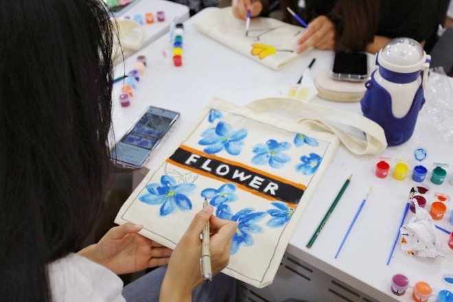 随后,同学们经过构思便纷纷投入到自己的设计中。同学们根据自己的想法和教程所学进行了自由创作,他们将植物的形状、纹理、颜色记录在帆布包上,为了使色彩更加丰富,运用颜料进行手绘,笔触间传递爱与温暖。活动过程中,同学们都全身心投入了手工拓印与手绘创作中,为一个小小的帆布袋倾注了自己的情感和思想,现场随处都能感受到同学们迸发出的创意火花。