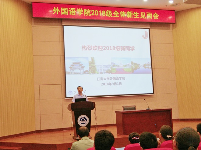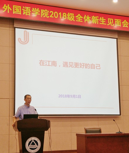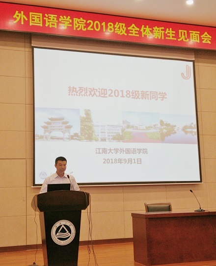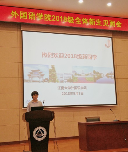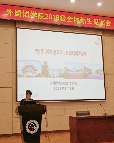 接着,教师代表严敏芬教授发言,她强调了培养语言能力的重要性,要注重时代科技的进步,互学互建,在江南大学拥有自己的标记以及绚丽多彩的生活。在校学生代表15级本科生段晓楠、18级本科新生代表初童、18级硕士新生代表杨知然也依次发言,大家都表达了江南大学的热爱之情以及如何在外院、在江大更好地完善自己,从而成就更好的自己。