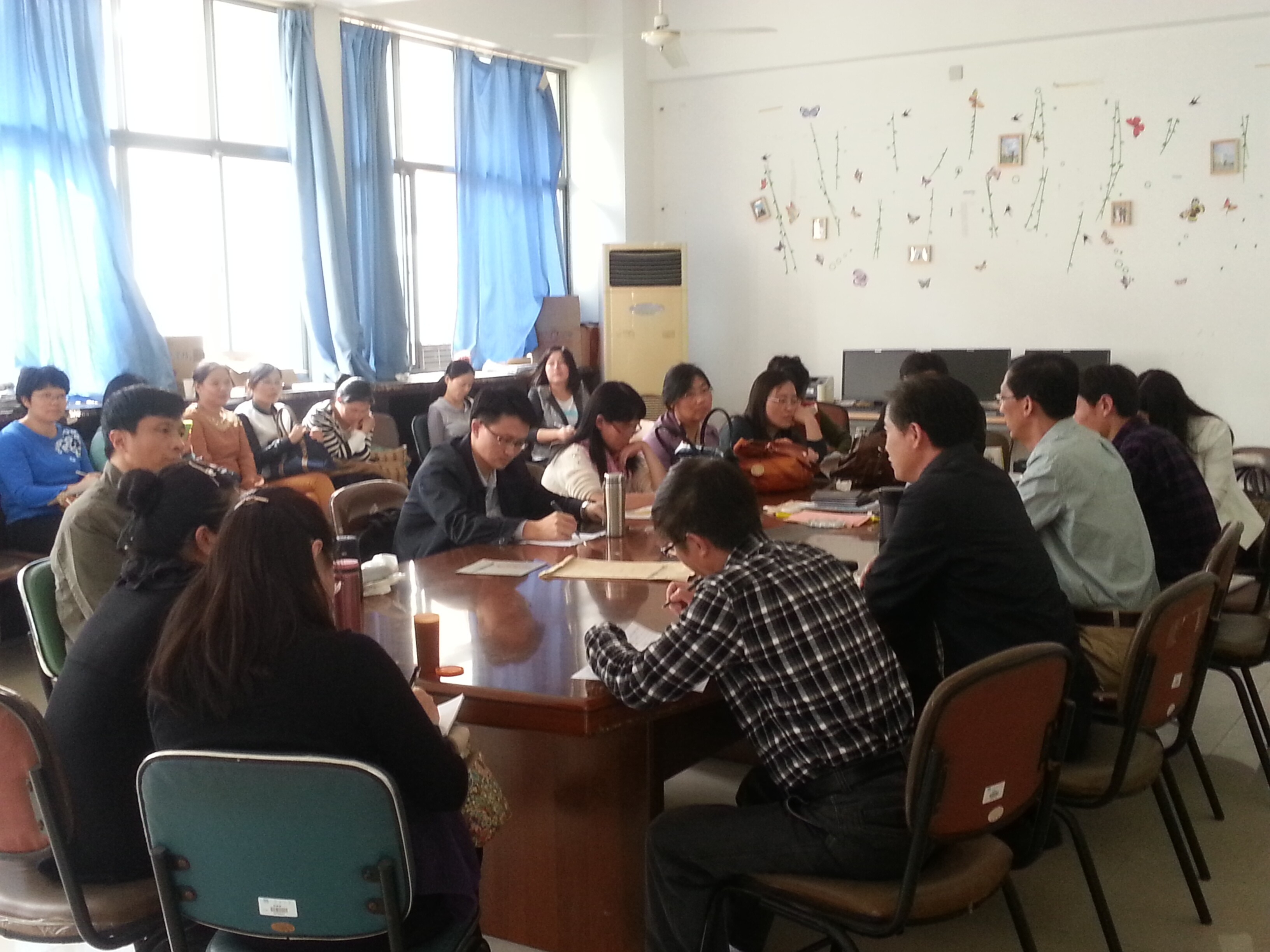 10月22日下午,英语系中外教员欢聚一堂,就英语系近期的学术安排、人事变更、中外协作、教研安排与团队建设等进行了传达与交流。教研活动由副院长李健雪教授与英语系主任孙志祥教授先后主持,院长龚晓斌教授与学院党委兼人事秘书许广玉老师也参加了部分活动。在集体活动后,英语系三个教研创新团队分三组进行了广泛而深入的交流与研讨。