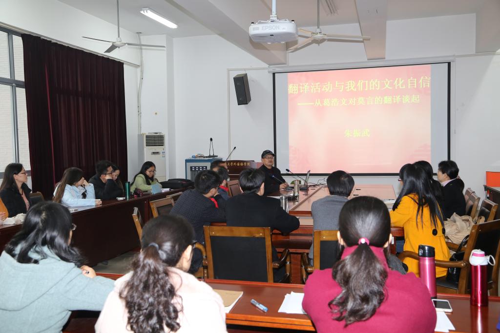1210日下午,上海大学博士生导师朱振武教授应邀在开云手机登录入口大会议室做了题为“翻译活动与我们的文化自信—从葛浩文对莫言的翻译谈起”的学术讲座。方文开副院长主持了讲座,我院数十名中青年教师和14级硕士研究生聆听了讲座。