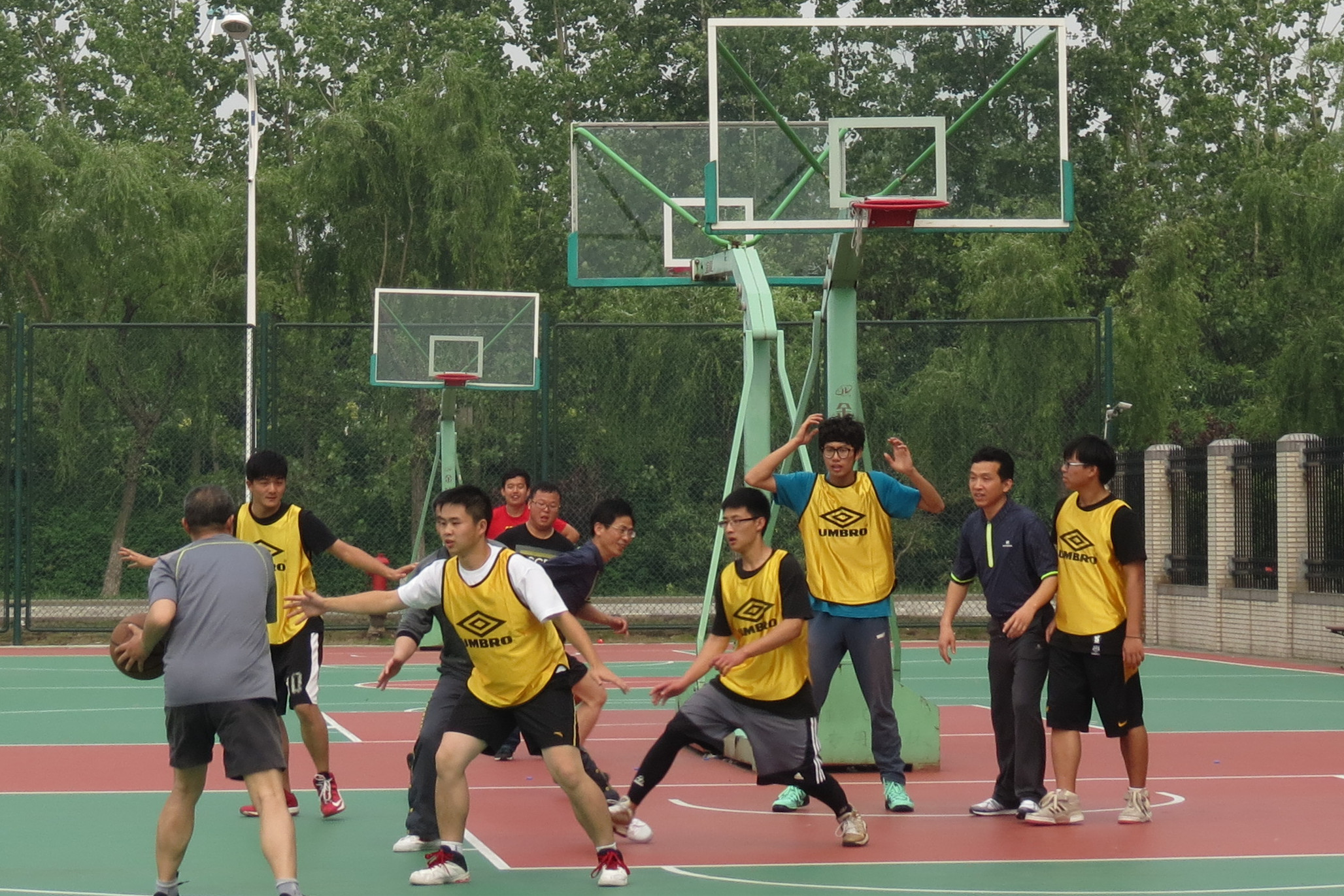 40多分钟的赛场竞技,老师们团结拼搏、英勇善战,但仍因体力上的悬殊,最终以41比54的分值差距输给了学生队。临近比赛结束双方队员进行了友好的合影留念。