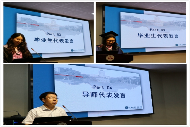 青春逢盛世,奋斗正当时。优秀本科毕业生代表宁梓含和优秀硕士毕业生代表李贵洁分别发言。她们用深情真挚的话语,回顾并分享了在江大学习、生活的点滴幸福与丰厚收获,表达了对恩师、对母校的衷心感谢与依依不舍。