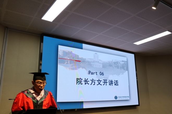 接下来,学院院长方文开以“以梦为马,不负韶华”为主题,充满激情又饱含温情地发表毕业致辞。首先,方文开对毕业生们表达了真挚的祝福,对老师和家长们表示了衷心的感谢。之后,他回顾总结了外院学子在班团集体建设、国家级学科竞赛、考研考博留学等一系列活动中的成长与收获,并对优秀班集体和优秀学生作出表扬。同时,方文开嘱咐同学们要坚定理想信念,肩负历史使命,永葆一颗爱国的初心,在前行的道路上以梦为马,不负韶华,不忘初心,发光发热。希望同学们能够一如既往地关心母校,情系外院,常回家看看!