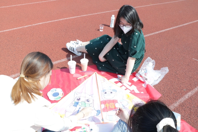 活动现场,大家根据事先设计好的风筝手稿,现场进行绘制工作。虽然纸鸢实际的材质与形状给同学们带来了一定的难度,但正因为如此,增加了活动的挑战性与趣味性。同学们纷纷发挥自己的创意,绘制的风筝充满春天的气息、青年的活力、战胜疫情的希望:以“国粹”为主题,展现了中华文化之美;以“春色”为主题,渲染春的灵动生机;以“抗疫”为主题,歌颂抗疫战士的奉献;以“冬奥”为主题,颂扬冬奥体育精神。绚烂的风筝飞向天空,打破了疫情的阴霾,这些风筝将带着大家美好的愿景与期冀,飞向远处的蓝天。