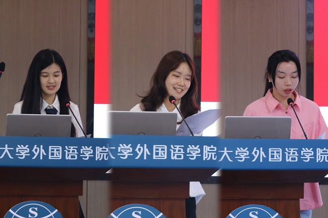 学生代表发言环节,在校生代表丁丁以自己丰富的经验为依托,向同学们传授了学习经验,并鼓励同学保持此刻年轻头脑里的疑问与思考,带着热爱砥砺前行。本科新生代表李梓潼表达了加入江大外院的欣喜与激动,与同学们一道回望了寒窗苦读十余年的难忘经历,也表达了对未来大学生活的向往与不负韶华时光的坚定决心。研究生新生代表杨可带着历尽千帆之后的坦然,向大家讲述了备战考研到成为江大外学研究生之一的学习历程。她以“追风赶月莫停留,平芜尽处是春山”一句结尾,与诸位同学共勉。