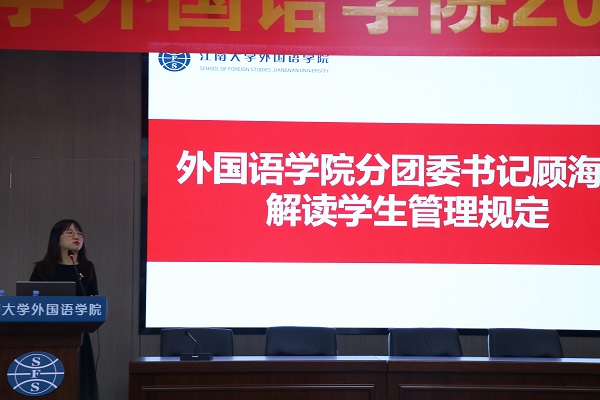 其次,开云手机登录入口分团委书记顾海星围绕学籍管理、教学管理、学院管理、评奖评优、勤工助学、违纪处罚等六大板块,详细解读了学生相关管理规定,强调严格考纪、成绩预警等方面的注意事项,帮助新生明晰学校与学院管理规章制度,为养成良好的学习与生活习惯打下基础。