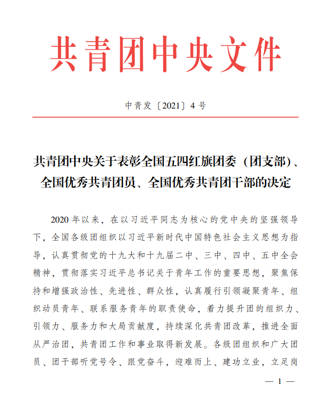 近日,共青团中央发布《关于表彰2020年度“全国优秀共青团员”“全国优秀共青团干部”“全国五四红旗团委(团支部)”的决定》(中青发(2021)4号),开云手机登录入口英语1701团支部荣获2020年度“全国五四红旗团支部”荣誉称号,这是我校基层团支部首次获此殊荣。该荣誉是共青团中央授予全国基层团组织的最高荣誉,今年全国共有370个团支部(团总支)获评,其中我省普通高校领域共5个团支部获评。