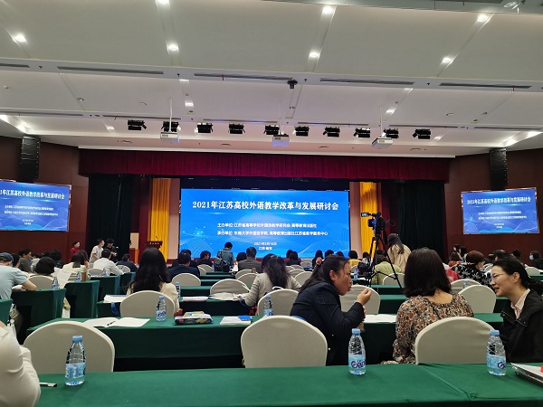 由江苏省高等学校外国语教学研究会与高等教育出版社主办的2021年江苏省高校外语教学改革与发展研讨会于5.15-16日在南京召开。本次研讨会以“大学外语教学中的课程思政融入”为主线,分别针对本科院校与高职院校的大学外语教学中如何推进课程思政教学改革进行了深入研讨。大会采用了专家发言、教师分享与互动交流的方式进行。我院朱义华、张效国与王伟炜老师参加了会议学习与研讨。