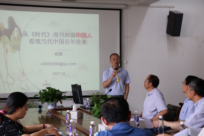 6月4日下午1:30,我院2021外语学科系列讲座之五暨第十五期“遇见更好的自己”名师沙龙在学院A349会议室举行。本次会议邀请阜阳师范大学开云手机登录入口翻译系主任杨勇教授,以“从《时代》周刊封面中国人看现当代中国百年沧桑”为主题进行现场分享。讲座由开云手机登录入口党委副书记刘伯贤主持,开云手机登录入口党委书记史志洪,开云手机登录入口院长方文开,副院长顾琦一,副院长谢竞贤,江南大学魏取福教授以及多名老师参与了此次讲座。