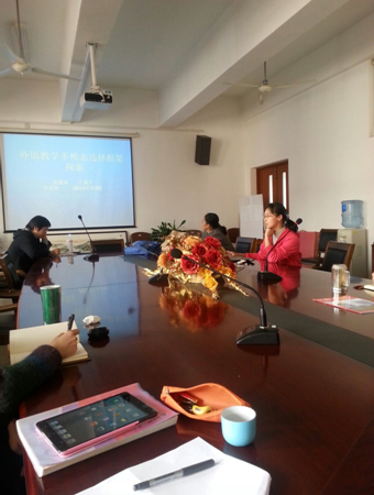 本次研讨会由朱莉老师主持。朱敏华老师首先给大家介绍了“多模态、多媒体、多环境下学生多元识读能力”的国内研究现状,指出今后此课题的研究趋势;接着,李健雪教授给大家做了“隐喻与课程评价模式”的讲座,讲座内容涉及课程评价发展历史、四代教育评价主要内容以及21世纪最有潜力的9种评价模式等,尤其强调Case Study在课程评价中的积极作用,使在座的老师对课程评价研究有了一个系统的认识。杨昊老师介绍了“个性化英语教学理念下自主学习平台的应用及其效果”,并从自主学习的目标、自主学习能力以及自主学习效果等角度对个性化英语教学进行了构想和设计;姜辰娟、李健和仇亦倩老师也分别介绍了各自主持的校教改课题“大学英语课堂引入真实性评价的研究”、“从精品视频公开课到MOOC——我校慕课课程设计的探索与实践”、“大学英语四年不断线课程的建构与研究”等。期间,严敏芬教授、李健雪副院长、顾琦一副院长和朱莉副教授对几位老师的课题研究,提出了许多建设性的建议和评论,使大家对课题研究有了进一步的认识和具体的研究思路。近两个小时的研讨紧张而又热烈,富有浓浓的学术氛围,张扬了“自由、个性、智慧、创新”的主题。