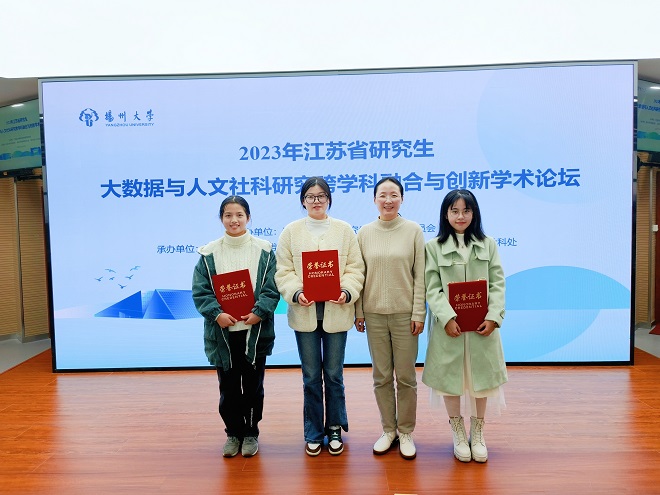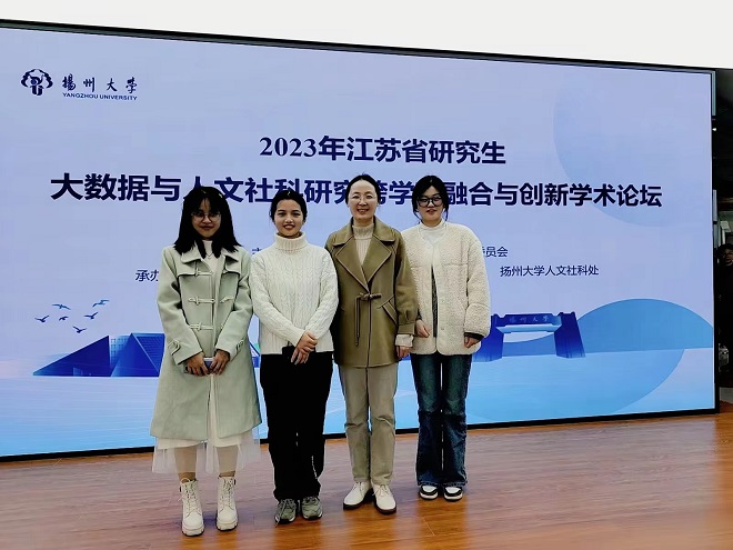2023年12月9日,江苏省研究生大数据与人文社科研究跨学科融合与创新学术论坛在扬州大学召开。本届论坛由江苏省文学类研究生教育指导委员会主办,扬州大学承办。来自省内10余所高校的49名硕博研究生与带队教师共同出席了本次学术论坛。我院2022级研究生王婷以及2023级研究生方漩和胡婷婷在谢竞贤副院长的带领下参加了本次论坛。
