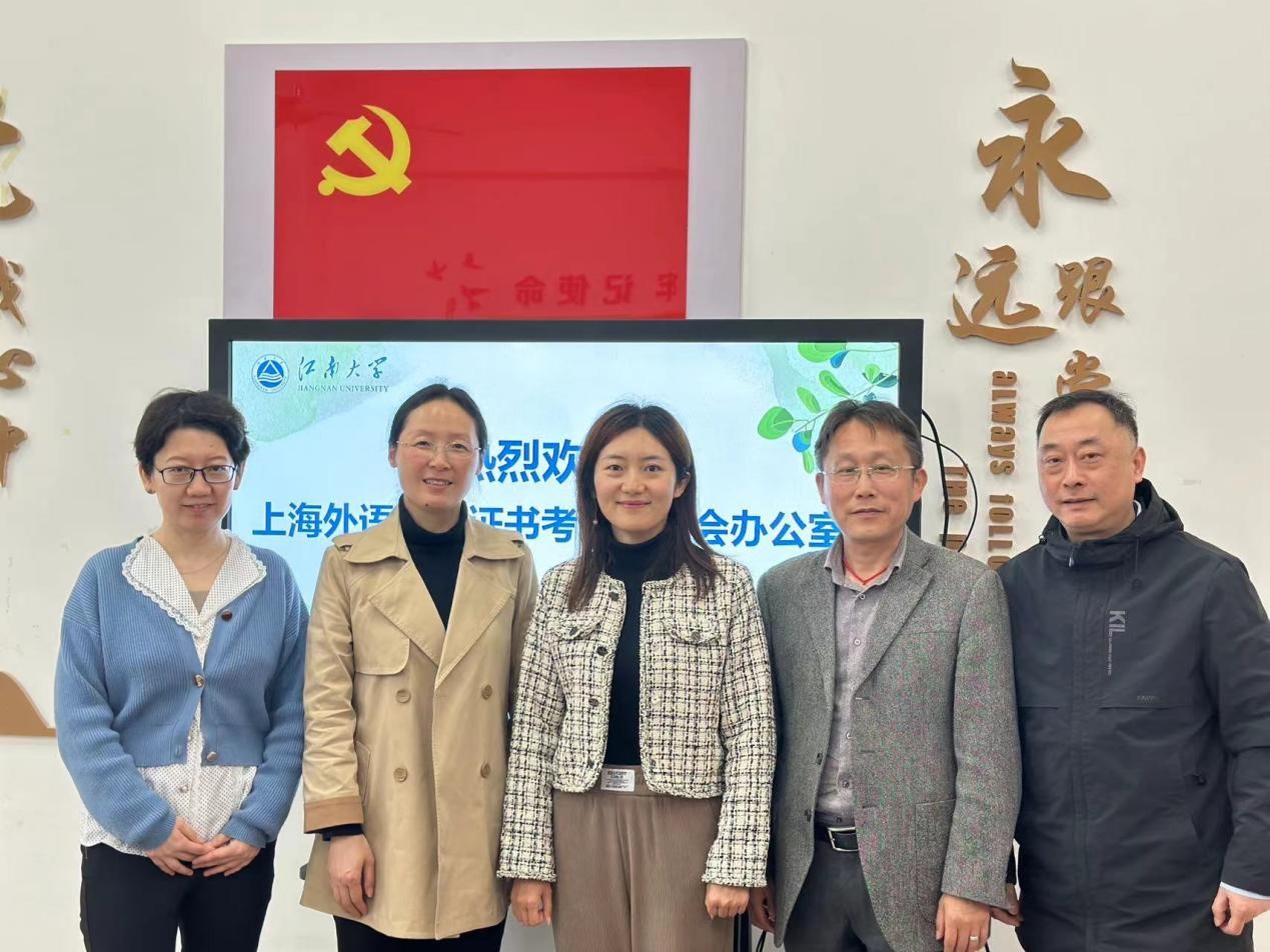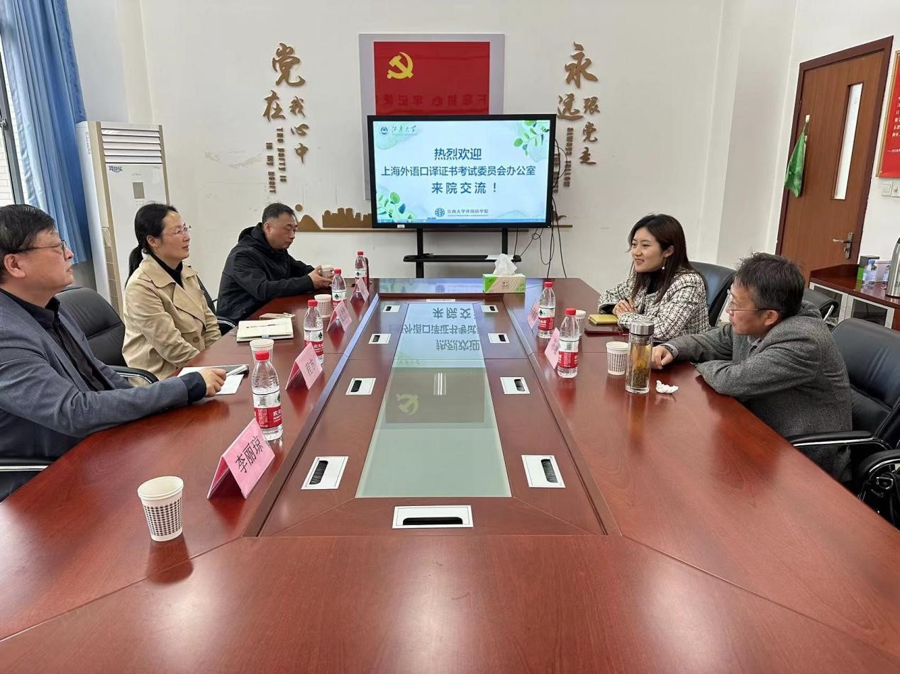 4月3日下午,上海外语口译证书考试委员会办公室李漪妮主任、陈曦老师来我院调研交流。学院谢竞贤副院长、社会合作与校友联络部程方主任等参加了座谈会。