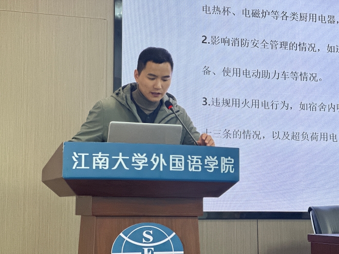 首先,苗文建结合《江南大学课程考核与管理实施细则》、《江南大学学生违纪处分规定》,向大家介绍了诚信考试的基本要求和重要性,强调了考试作弊的严重后果,通过列近期学生发生的考试作弊案例,引导学生们从中吸取教训,认真复习备考,树立诚信考试观念。冬季气温降低,学生宿舍用电安全问题进一步凸显。会议上,苗文建结合学校的《关于加强冬季防火、用电安全管理的通知》、《关于开展学生宿舍冬季用电安全专项检查的通知》,强调了宿舍严禁使用违章电器,严禁违规用火用电等行为。